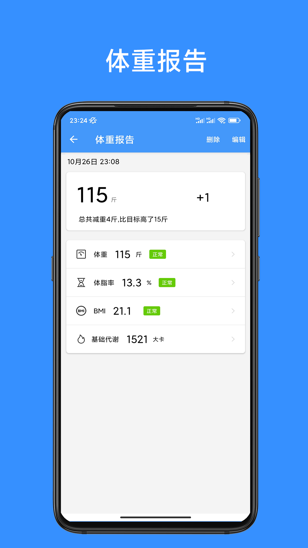 3. 可对体重数据进行编辑和删除操作。
